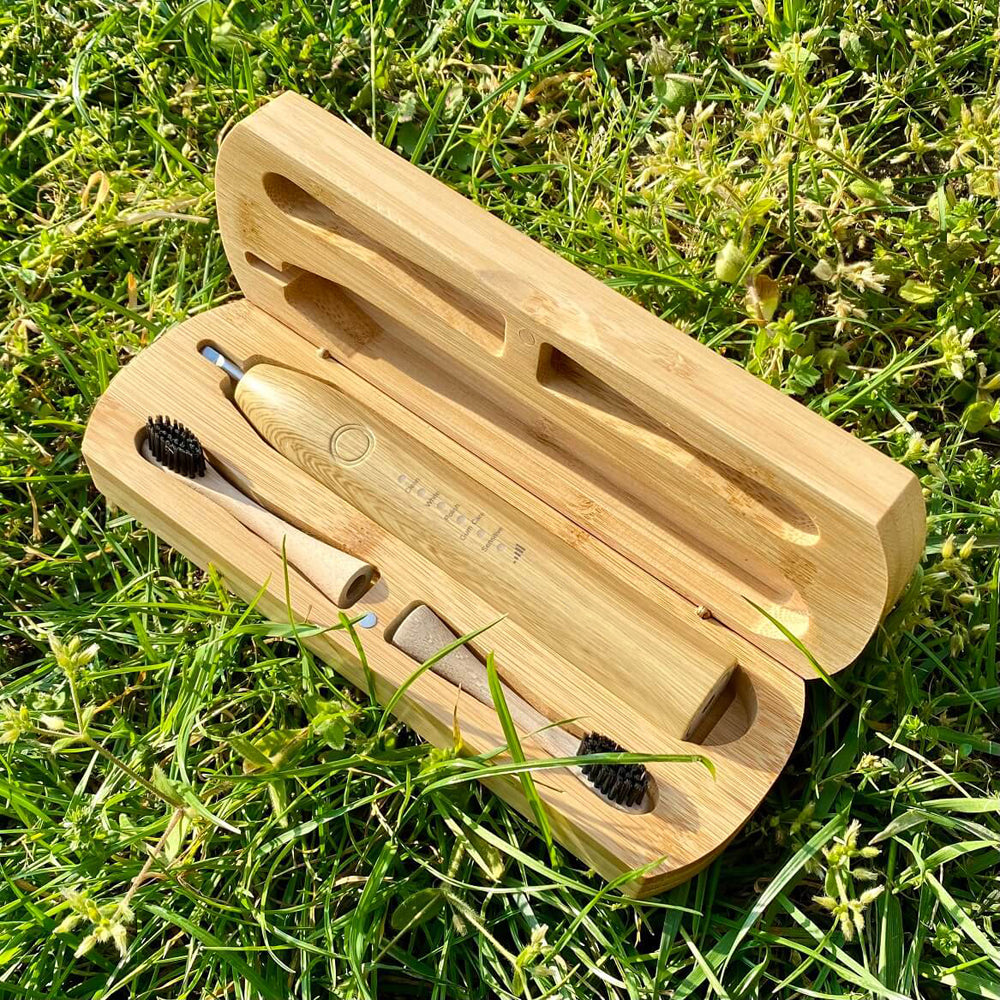 The replaceable toothbrush heads and travel case are zero-plastic — made from 100% bamboo.